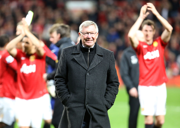 MANCHESTER, ENGLAND – APRIL 22: Manager Sir Alex Ferguson of Manchester United celebrates at final whistle of the Barclays Premier League match between Manchester United and Aston Villa at Old Trafford on April 22, 2013 in Manchester, England. (Photo by Tom Purslow/Man Utd via Getty Images)